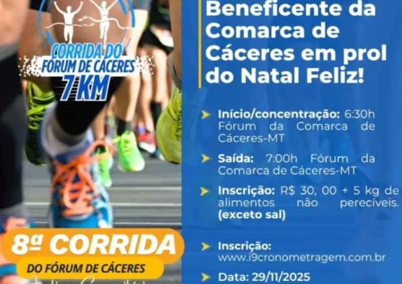 A Comarca de Cáceres realiza, no próximo dia 29 de novembro de 2025, a 8ª Corrida do Fórum Natal Feliz, evento que une atividade física e solidariedade. Parte do valor arrecadado com as inscrições será revertida em alimentos para famílias em situação de vulnerabilidade. A largada será às 7h, em frente ao Fórum de Cáceres.